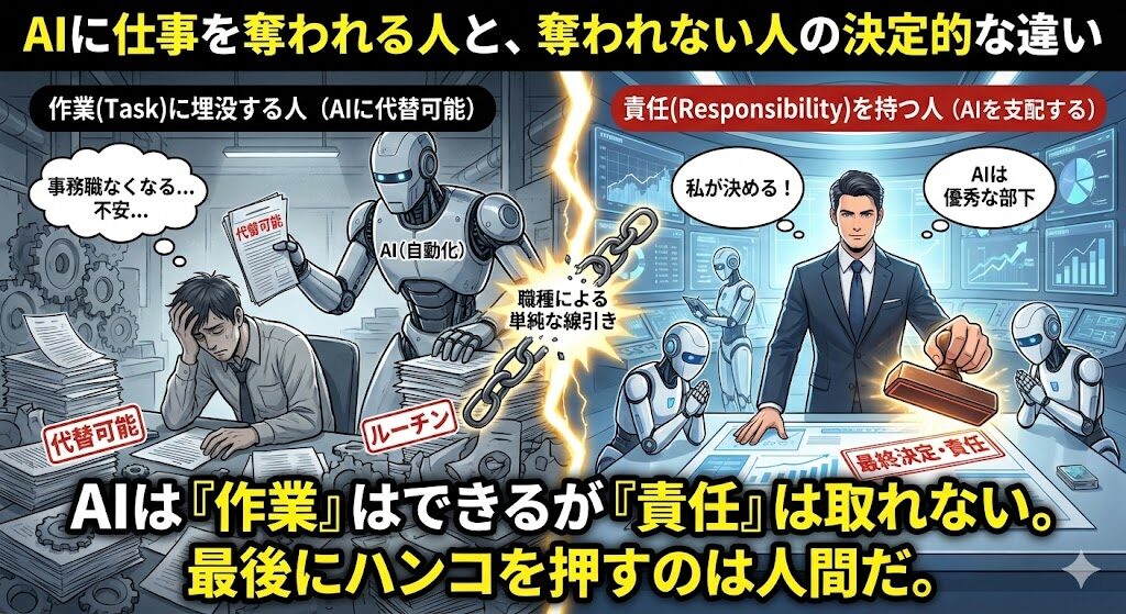 AIが本当に奪うのは「タスク(作業)」であって、「ロール(役割)」ではない。そして最も重要なのは、AIは絶対に「責任」を負えないという事実だ。