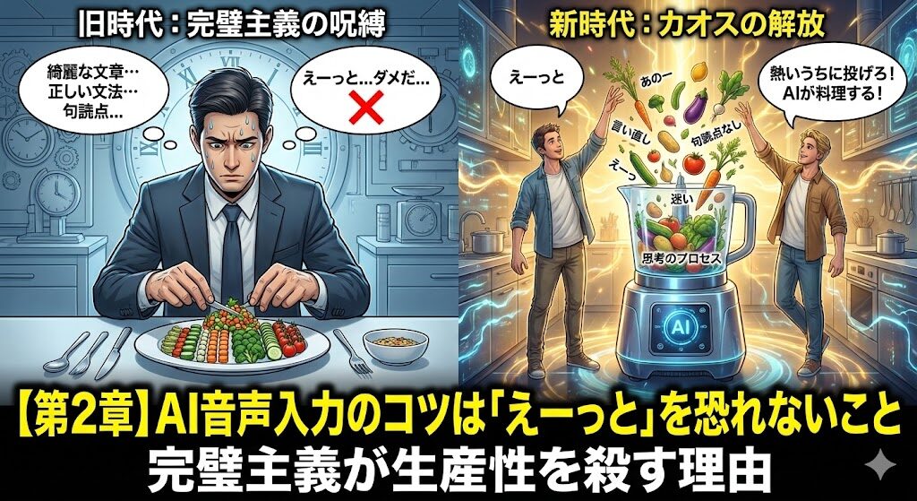 次章では、この「カオスを投げる」という行為を、さらに実践的なレベルに落とし込んでいく。具体的に、どんな場面で、どんな風に音声入力を使えば、あなたの生産性は最大化されるのか。そして、多くの人が陥る「音声入力の落とし穴」とその回避法について解説する。