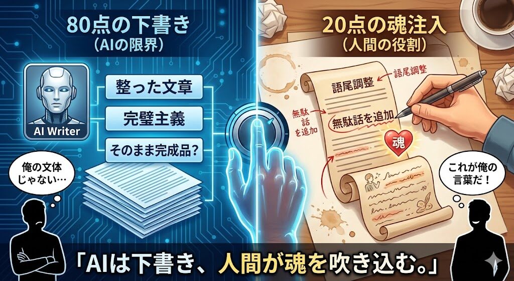 AIの出力は「誰が読んでも分かる80点の文章」だが、そこに「無駄話」「言い淀み」「独自の比喩」という隠し味を入れることで、「あなたにしか書けない文章」になる。