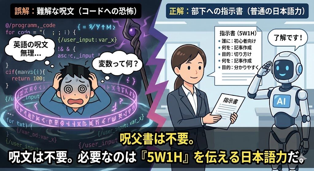 プロンプトという言葉には、「特殊な技術」「専門知識」「複雑な設定」といったノイズが纏わりついている。その言葉を使うたびに、あなたの脳は「これは難しいもの」というバイアスを強化する。